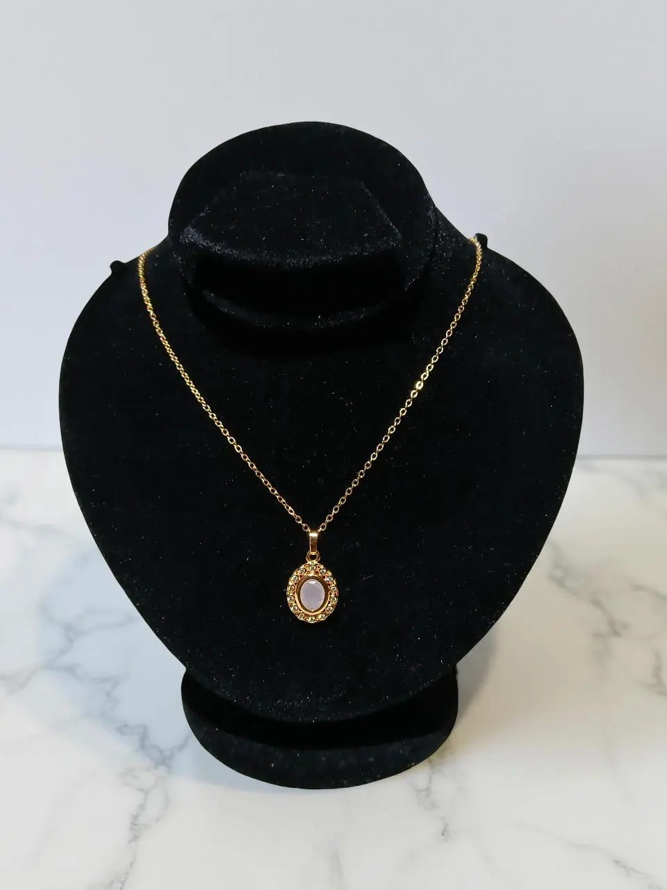 Enhance your jewelry collection with the Gold-Tone Oval Pendant Necklace with Sparkling Stones. The necklace features a beautifully crafted oval-shaped pendant with a radiant round gemstone at the center. Surrounding the stone are delicate sparkling stones that amplify its brilliance, making it a perfect accessory for both casual and formal occasions.