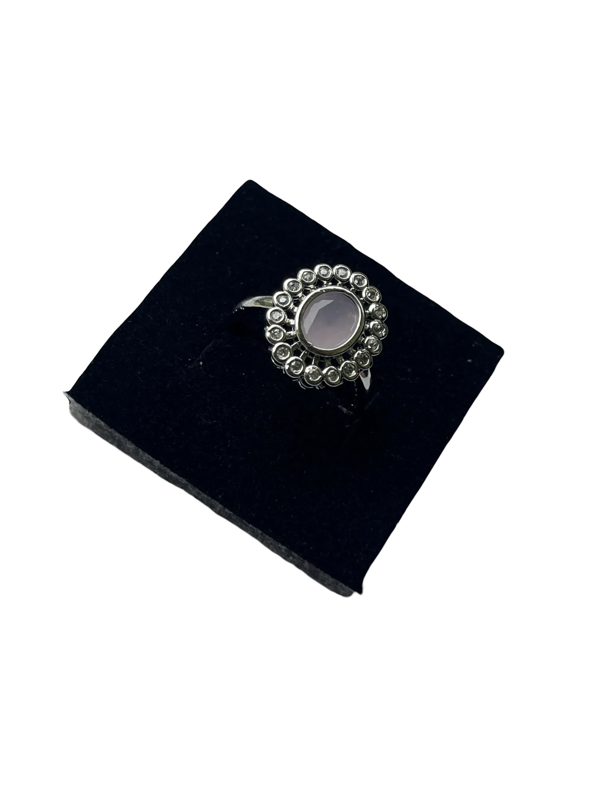This elegant Silver-Tone Floral Gemstone Ring features a central gemstone surrounded by sparkling stones, offering a timeless, vintage-inspired design perfect for any occasion.